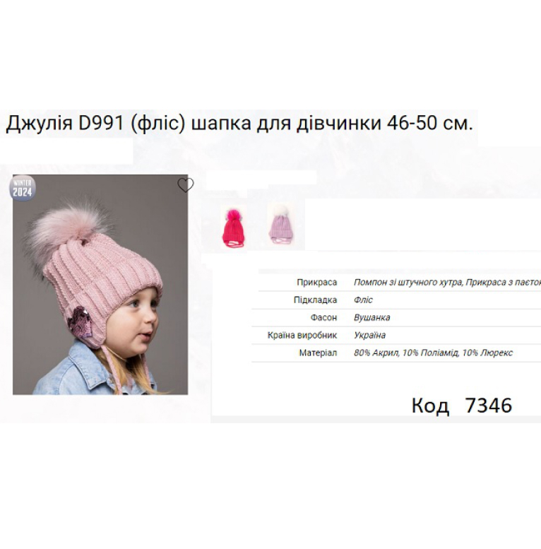 ALex Шапка в'язана на флісі для дівчинки (на зав'язках) ДЖУЛІЯ D991 46-50 5(1)шт.