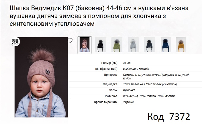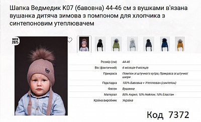 ALex Шапка в'язана синтепон на трикотажі для хлопчика (на зав'язках) Ведмедик К 07 44-46 5шт.